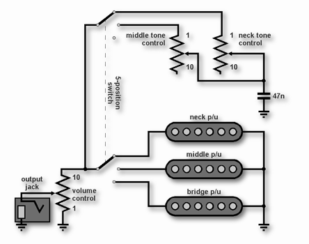 The main differences of the new circuitry are the humbuckers at the neck abd bridge position, serial/parallel switches for those humbuckers and the elimination of the ground loops. Everything is directly connectd to a virtual ground (one pin of a capacitor (0.68µF/300V). This capacitor increases the safty if the guitar too. In case yer amp turns into a killer amp, the DC is not directly connected to the guitar's ground, the bridge and the strings. This is why the capacitor is at least a 300V type. |