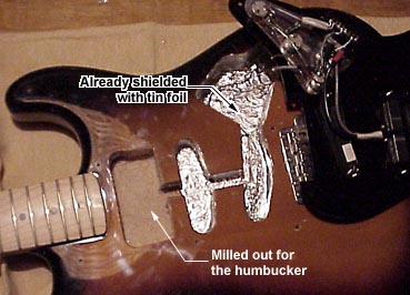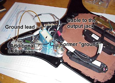 |   | The additional capacitor is glued to the pick guard. All wires that were formerly connected to the ground are now connected to one lead if this capacitor. The housings of the pots are connected to the new ground lead. The cables to the output jack is replaced by a shielded cable. It's shield is connected to the "former ground". |