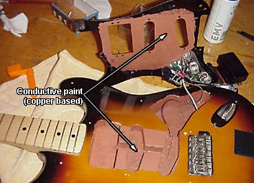 After removing the tin foil, applying the copper based paint  and modifying the circuitry like described before, you can hardly hear any hum. It becomes noticeable when I hold the guitar really close to the monitor (maybe 4 or 5 inches).
