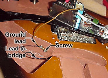 | An eye is soldered to the end of the cable to the bridge and to the ground lead. Those cables are screwed into the body to provide a connection to the shielding which is formed by the conductive paint. |   |